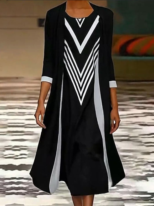 Women's Casual Round Neck Vest Contrast Color Printed Dress and Cardigan Set