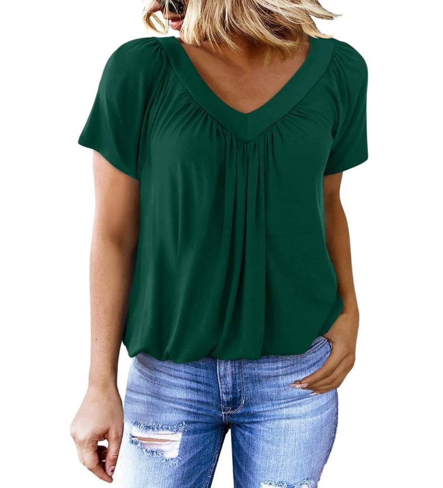 Casual Women's Top with Pleated V-Neck and Short Sleeves