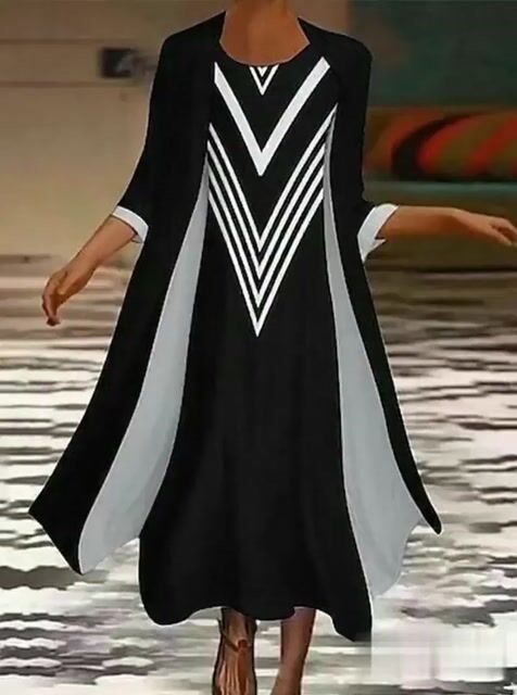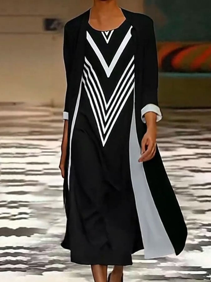 Women's Casual Round Neck Vest Contrast Color Printed Dress and Cardigan Set